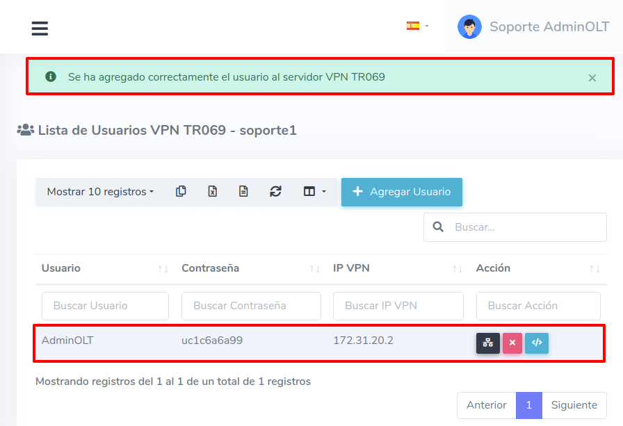 3Una vez guardado nos regresará a la lista de Usuarios VPN TR069 donde podremos ver un mensaje confirmando que se agregó correctamente.
