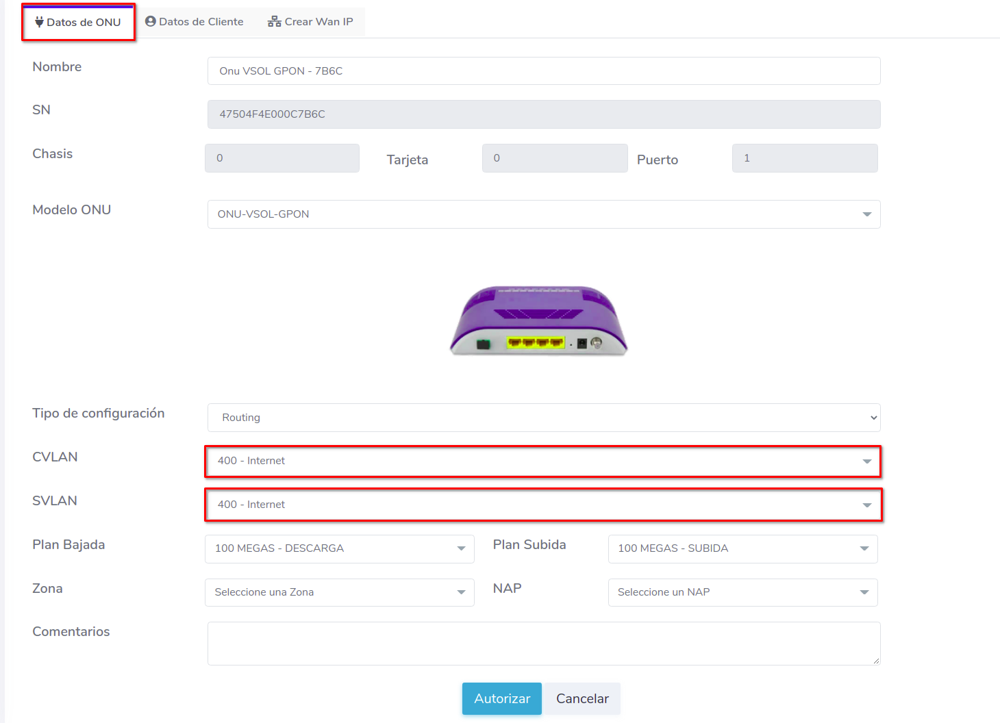 Para crear una WAN IP al momento de autorizar, se recomienda leer el siguiente manual que habla sobre el tema más a fondo; Configuración WAN IP VSOL