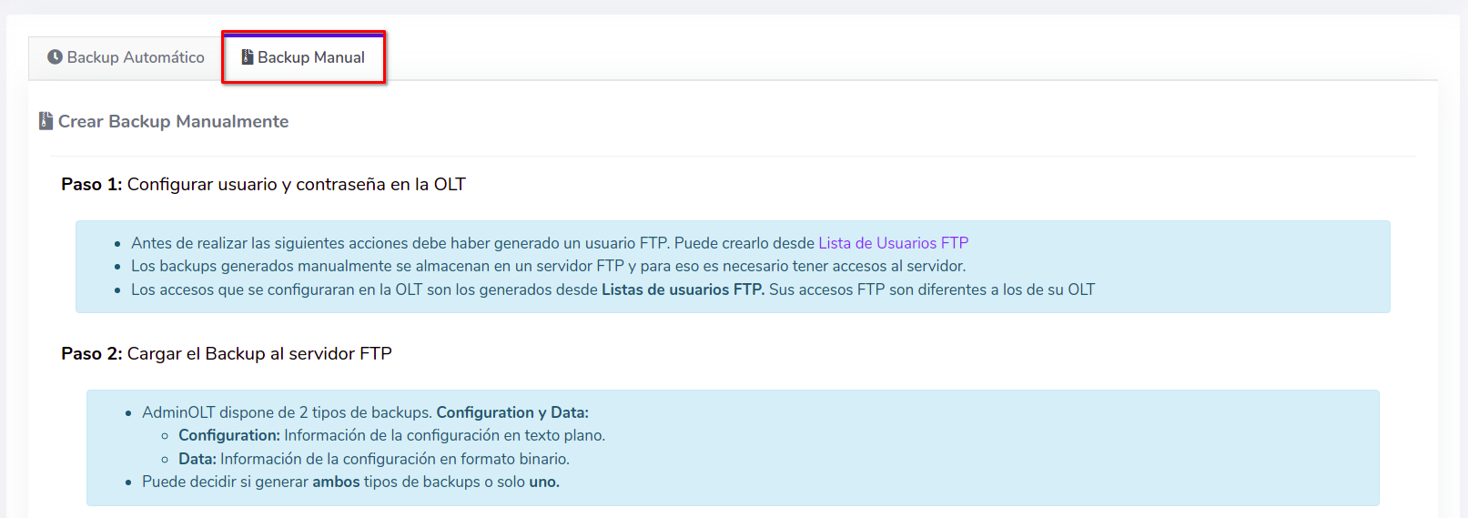 El sistema AdminOLT ofrece un acceso a un servidor FTP para el usuario. Esta información se configura en la OLT donde está última a base de los comandos específicos enviara la información al servidor antes mencionado. Si tiene dudas sobre donde conseguir estos accesos, puede consultar el siguiente manual. Usuarios FTP