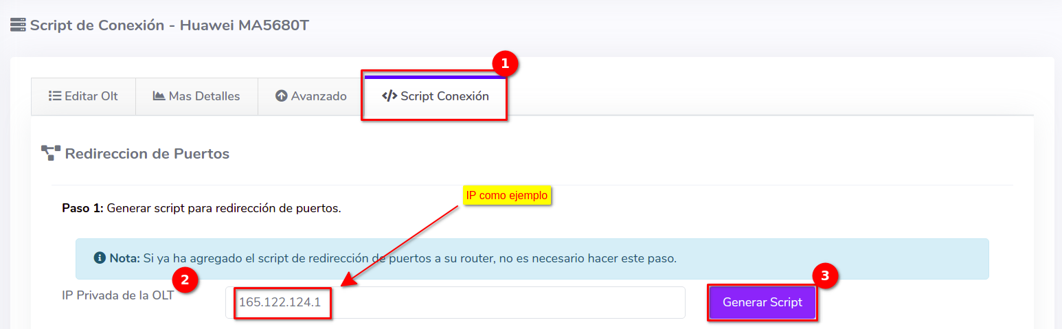 Recuerde usar las reglas adecuadas del Script de Conexión de AdminOLT con el fin de garantizar la conexión entre el servidor FTP y su OLT. Edite su OLT y en el apartado de Script de Conexión escriba la IP privada de su OLT para generar la información correspondiente.