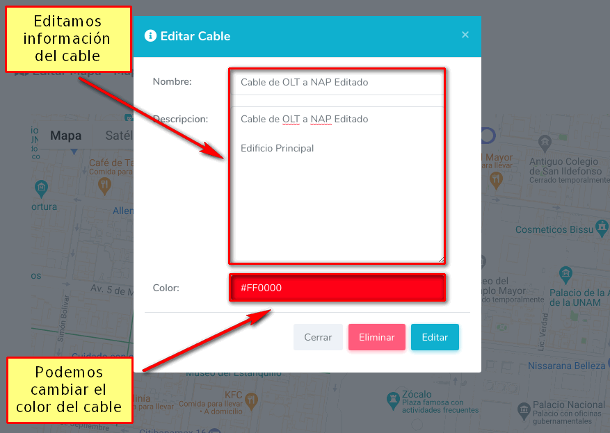 Una vez que demos click en el segundo marcador, nos saldrá una ventana donde tendremos que poner la información acerca del cable, después damos click en Si, estoy seguro.