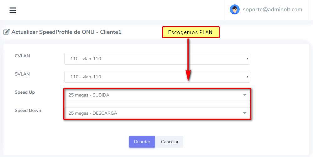 Para este ejemplo usaremos una ONU Autorizada que inicialmente tiene un Plan de 100 Megas Simétrico, en este caso nosotros lo cambiaremos a un Plan de 25 Megas Simétrico.