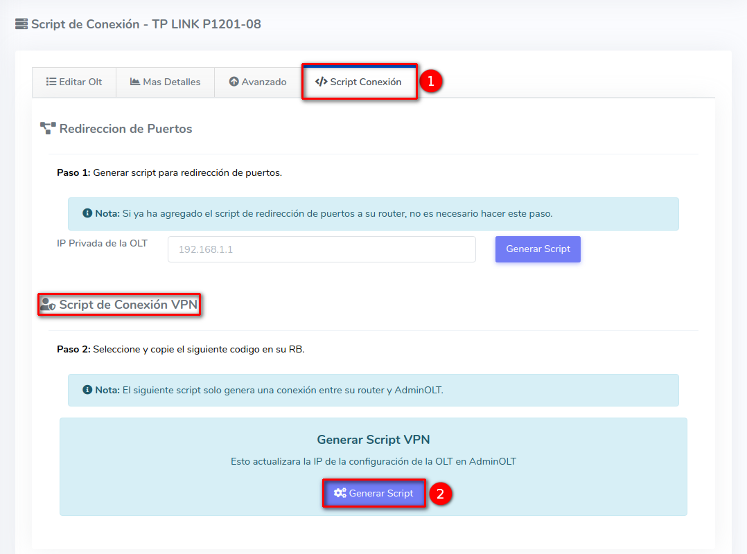 2 Nos dirigimos a la pestaña Script Conexión y en el apartado Script de Conexión VPN seleccionamos el botón con la leyenda Generar Script.
