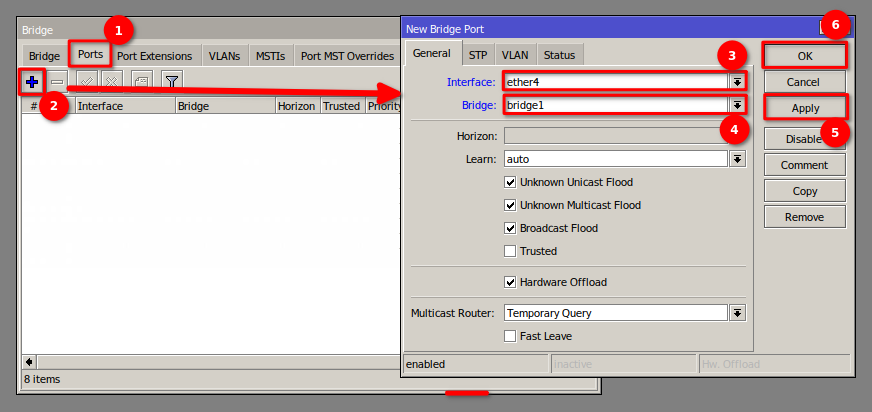 2 Asignamos al bridge1 los dos puertos que conectan a la OLT.