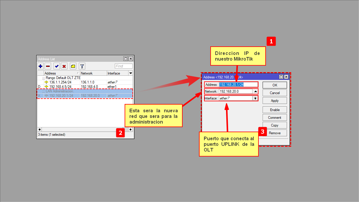 - 1.- Agregamos el segmento default de la OLT: 136.1.1.254/24 para que el Mikrotik tenga comunicación con la OLT