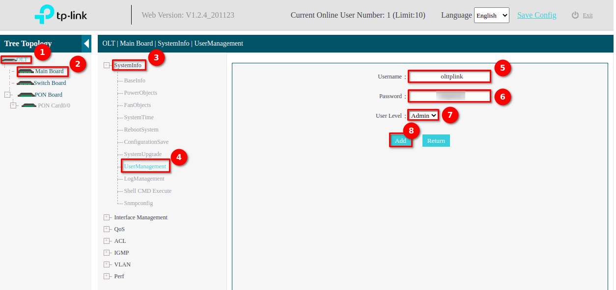 7 Creamos un usuario en la OLT, el cual nos servirá para conectarlo con AdminOLT