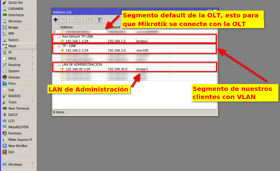 2 Debemos tener agregadas nuestro Vlan, LAN De Administración y LAN de Segmento de Clientes. Para más información puede leer el manual Configuración en RouterBoard MikroTik para OLT TP-LINK