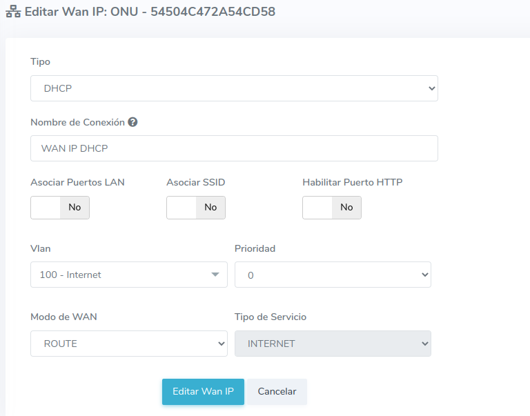 - 1.-Tipo: En AdminOLT se pueden crear configuraciones WAN IP de tipo STATIC y DHCP. En este ejemplo crearemos una WAN IP DHCP.