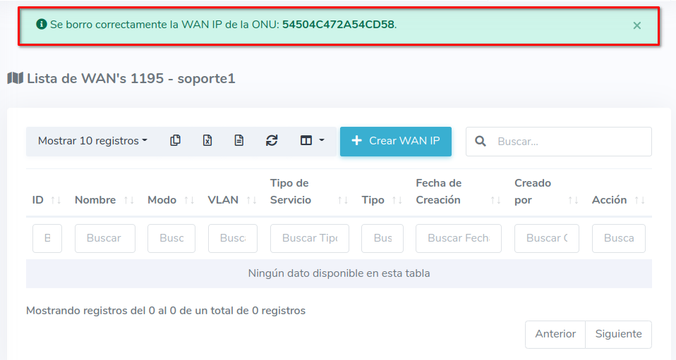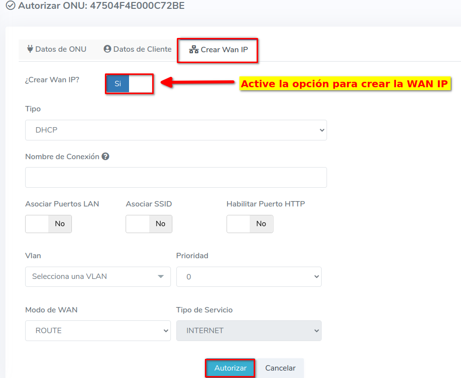 2Seleccione la opción Crear WAN IP y complete el formulario, con este proceso podrá autorizar y crear una WAN IP a una ONU al mismo tiempo.