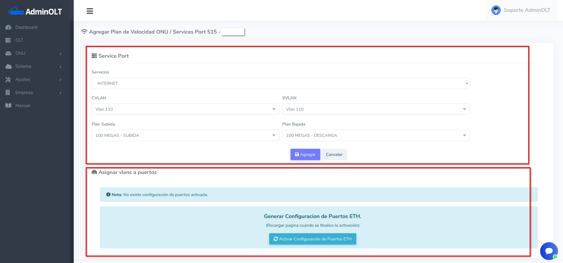 4 Seleccione un Servicio, seleccione un plan de subida, de bajada, el puerto a donde ira dirigida esa vlan y en que modo.