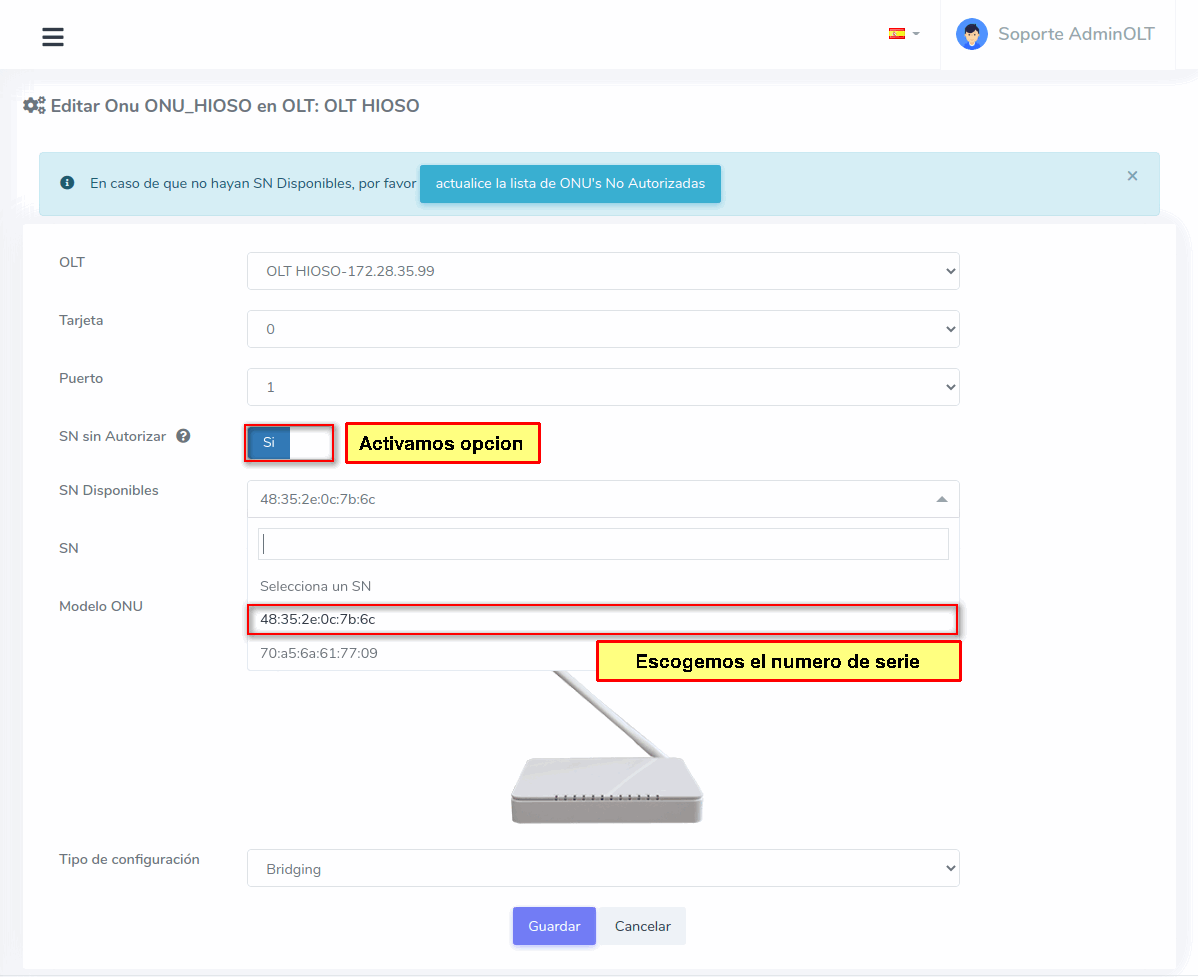 En caso de que la opción de SN Disponibles no le muestre resultados, a pesar de tener Onus de la misma marca de la OLT en la lista de ONUs no Autorizadas, presione el botón que se encuentra en el cuadro azul, lo llevara a la lista de ONUs No Autorizadas.