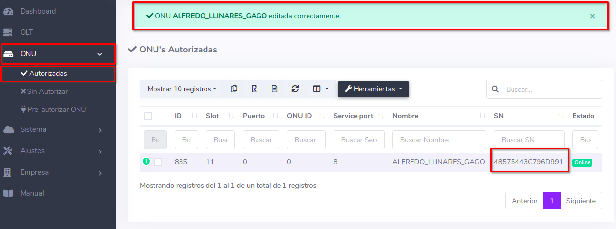 Pasos para editar información de ONU Autorizada por SN