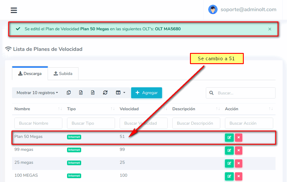 Al modificar un Plan de Velocidad, por ejemplo, de 50 megas a 51 Megas los clientes actuales relacionados al plan se verán afectadas, por lo tanto su nueva velocidad seria de 51 megas.