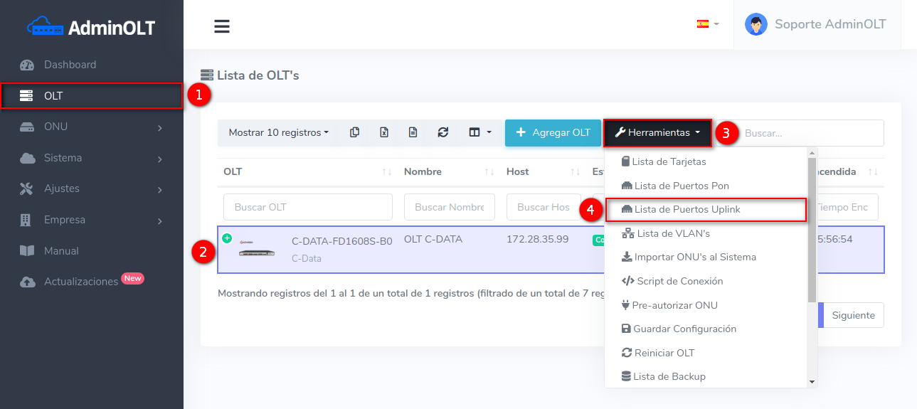 1 En la Lista OLT's seleccionamos el equipo con el que trabajaremos para después ir a Puertos Uplink, que se encuentra en el botón con la leyenda Herramientas.