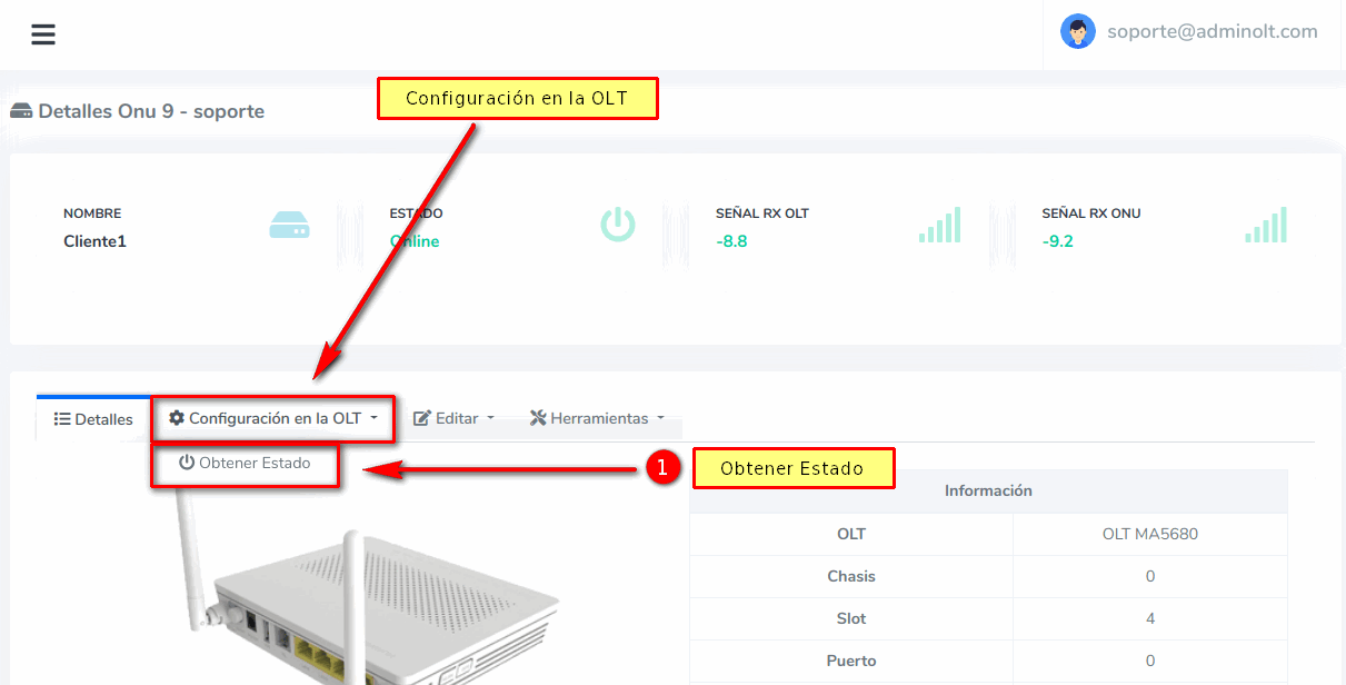 1.- Obtener Estado: Para más información puede leer el apartado ¿Como puedo ver la configuración de la ONU que tiene en la OLT?