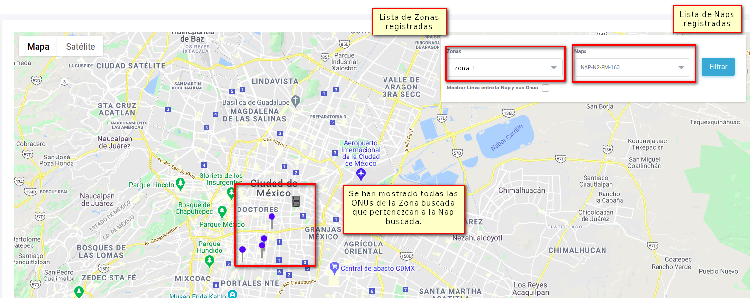 - Naps: Si necesita mostrar las Onus que pertenezcan a la Nap filtrada. (También mostrara la Nap en el mapa.)