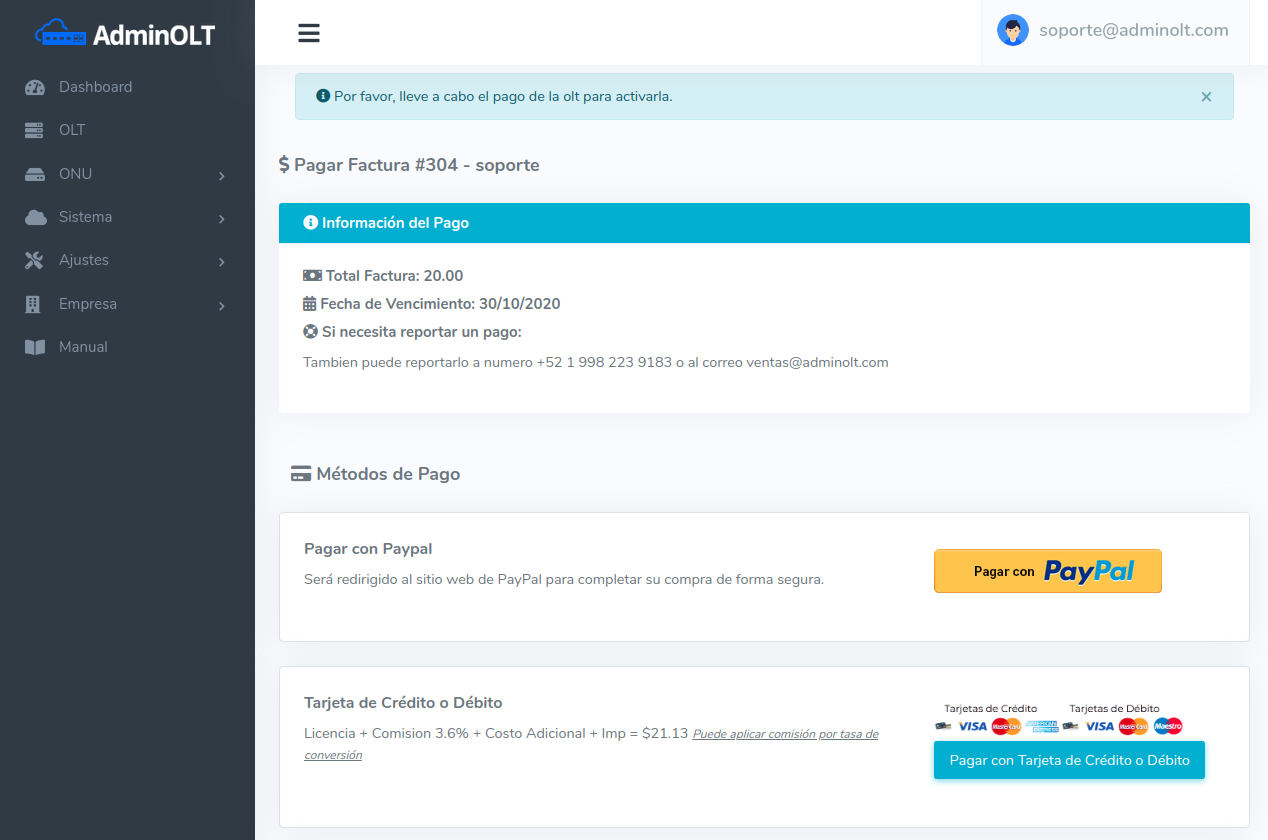 Detalles Sobre Facturas: El precio de las facturas es dependiendo del precio del plan con la que se encuentre la OLT del cliente y la cantidad de OLT's registradas.