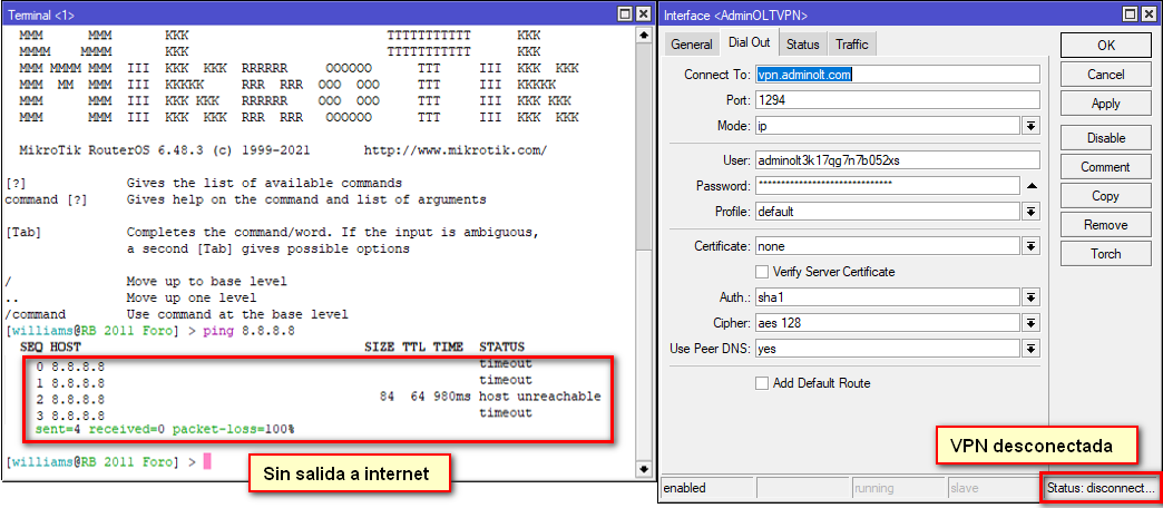 Si presenta error de conexión actualmente ya podemos validar si es un error del servidor de la VPN o en un error como que la interfaz de la VPN se encuentre deshabilitada o sea un detalle de redirección de puertos, los cuales tienen que ver especificamente con validar datos en nuestro equipo MikroTik