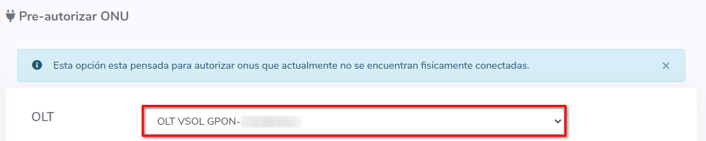 Es necesario que como primer paso sea seleccionar la OLT donde se realizara la acción. Al momento de seleccionar alguna OLT, se autocompletaran algunos datos del formulario, por ejemplo Tarjetas, Puertos o VLAN.
