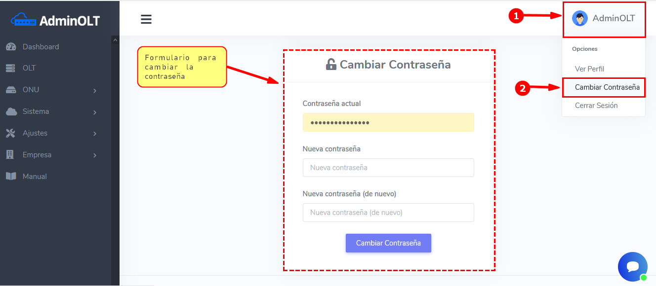 Al registrarse en AdminOLT se le asigna una contraseña por defecto al usuario administrador, por lo que es importante una vez que reciba sus accesos cambiarla por su propia contraseña.