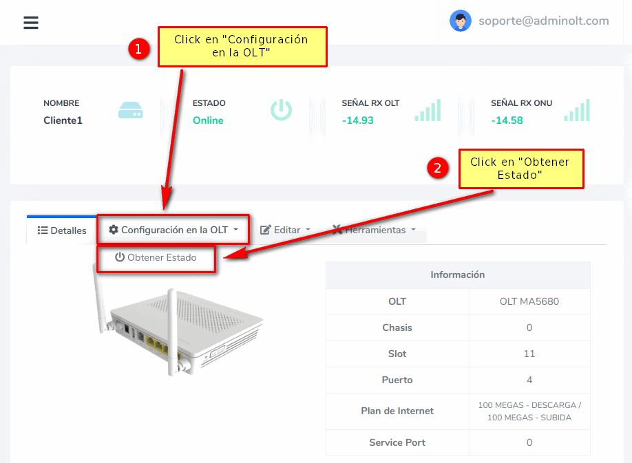 3 Damos click en Configuración en la OLT y seleccionamos Obtener Estado.